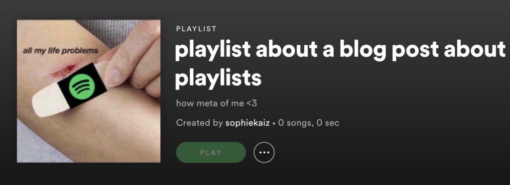 While my fervor for mixtape-making and my adamance in using it as a means for documenting life may seem excessive, I insist that every single human with a music service and a streaming device should be making copious amounts of playlists, as well (although the superior service in question is absolutely Spotify—no matter.) It is therapeutic and easy, allowing you to creatively chronicle your day/week/life without the pressure of composing something that you would actually want to go back and read, sans cringe. Instead, perfectionism dissipates with every added song: there’s no need for eloquence when the lyrics have already been written! Like a sonic scrapbook, you can hit shuffle your cleverly titled, carefully curated selection and be immediately brought back to the sounds, feelings, and memories that typified any season of life, from the mundane nature of life in quarantine to the extraordinary reality of simply existing. During a literal pandemic.